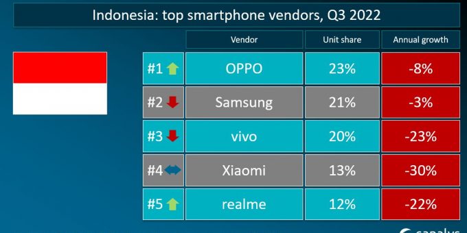 Berdasarkan laporan IDC pada kuartal ketiga tahun ini, Oppo menyabet posisi pertama sebagai raja smartphone Indonesia mengalahkan merek lain seperti Samsung, Xiaomi dan Vivo. Pada periode itu Oppo mencatat total pengiriman 441 persen dibandingkan tahun lalu hanya 15 setengah persen. Model Reno 8 mendorong Oppo dalam segmen smartphone 5G di Indonesia yakni mencapai 191 persen. Samsung berada di belakang Oppo. Segmen low-end samsung berhasil ditingkatkan menjadi 646 persen berasal dari A13 an A03. Vivo bertahan di posisi ketiga, saat pangsa portofolio segmen mid-range meningkat dua kali lipat menjadi 148 persen. ( tbu )