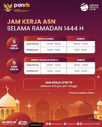 Kementerian Pendayagunaan Aparatur Negara dan Reformasi Birokrasi telah mengeluarkan peraturan jam kerja bagi Aparatur Sipil Negara selama bulan Ramadan. Secara umum, jam kerja ASN selama bulan Ramadan menjadi jam 08 pagi hingga jam 3 sore setiap hari Senin hingga Kamis dengan jam istirahat 30 menit mulai jam 12 siang, sedangkan untuk hari Jumat, jam kerja ASN sejak jam 8 pagi sampai setengah 4 sore dengan jam istirahat mulai dari jam setengah 12 hingga jam setengah satu siang. Bagi instansi pemerintah yang menerapkan enam hari kerja, jam kerjanya menjadi jam 8 pagi hingga dua siang pada hari Senin sampai Kamis dan hari Sabtu. ( ben )