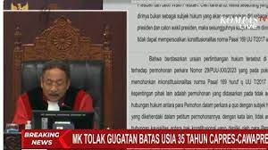 Mahkamah Konstitusi menolak gugatan uji materi batas usia minimal calon presiden dan calon wakil presiden dalam Undang-Undang 7 Tahun 2017 tentang Pemilu. MK menolak syarat usia capres-cawapres diturunkan menjadi 35 tahun, yang sebelumnya diajukan oleh sejumlah kader Partai Solidaritas Indonesia, PSI. Ketua MK, Anwar Usman dalam sidang pembacaan putusan menyatakan gugatan ditolak seluruhnya. Pasalnya, penentuan usia minimal capres-cawapres menjadi ranah pembentuk undang-undang. Untuk itu, Mahkamah konstitusi tidak dapat menentukan batas usia minimal bagi calon presiden dan calon wakil presiden lantaran dimungkinkan adanya dinamika di kemudian hari. ( ben )