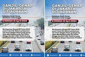 Dinas Perhubungan DKI Jakarta menyatakan, aturan ganjil genap di beberapa ruas jalan Jakarta ditiadakan selama libur Lebaran Idul Fitri 1145 Hijriah.  Dalam akun media sosial Instagram @dishubdkijakarta diinformasikan, aturan ganjil genap ditiadakan selama sepekan, sejak 8 hingga 15 April 2024. Ketentuan itu berdasarkan Surat Keputusan bersama Menteri Keternagakerjaan dan Menteri Pendayagunaan Aparatur Negara dan Reformasi Birokrasi dan Menteri Agama Republik Indonesia tentang Hari Libur Nasional dan Cuti Bersama Tahun 2024.  Aturan peniadaan ganjil genap itu juga disebut sesuai Peraturan Gubernur DKI tentang Pembatasan Lalu Lintas. ( tbu )