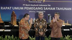 Rapat Umum Pemegang Saham Tahunan Bank Maybank Indonesia memutuskan mengganti posisi direktur utama dan juga membagikan dividen 785 miliar rupiah dari laba tahun buku 2023. RUPST menyetujui Laporan Keuangan Konsolidasian untuk tahun 2023 dengan Laba Bersih 1 koma 7 triliun rupiah yang 45 persennya dibagikan sebagai dividen tunai ke pemegang saham. Sisanya digunakan sebagai laba ditahan. Selain itu, pemegang saham juga menyetujui berakhirnya masa jabatan Taswin Zakaria selaku Presiden Direktur Maybank Indonesia serta Thilagavathy Nadason, Muhamadian, Irvandi Ferizal, dan Widya Permana selaku Direktur Maybank Indonesia. Rapat juga mengangkat kembali Irvandi Ferizal dan Widya Permana selaku Direktur Perseroan. Kemudian RUPST juga menyetujui pengangkatan Steffano Ridwan sebagai Presiden Direktur Bank Maybank Indonesia, Shaiful Adhli Yazid sebagai Direktur, dan Yessika Effendi sebagai Direktur yang membawahkan Fungsi Kepatuhan Perseroan serta Romy Hardiansyah sebagai Direktur Unit Usaha Syariah. ( tbu )