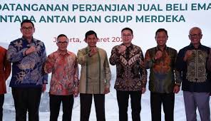 PT Merdeka Copper Gold melalui anak usahanya yakni Bumi Suksesindo BSI dan Merdeka Gold Resources melalui anak usahanya Puncak Emas Tani Sejahtera PETS menandatangani Gold Sales and Purchase Agreement dengan Aneka Tambang. Perjanjian ini berlaku selama dua tahun dengan total volume transaksi 3 metrik ton atau hampir 100 ribu ounce emas per tahun dengan opsi untuk menambah 3 metrik ton lagi per tahunnya. Dalam skema ini, BSI dan PETS bertindak sebagai penjual, sementara ANTM sebagai pembeli emas granula hasil pemurnian domestik. Kerja sama ini merupakan langkah strategis untuk memastikan penyerapan produksi emas dibawah Grup Merdeka secara optimal didalam negeri sekaligus memperkuat integrasi rantai pasok hulu-hilir nasional.( tbu )